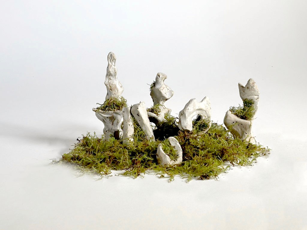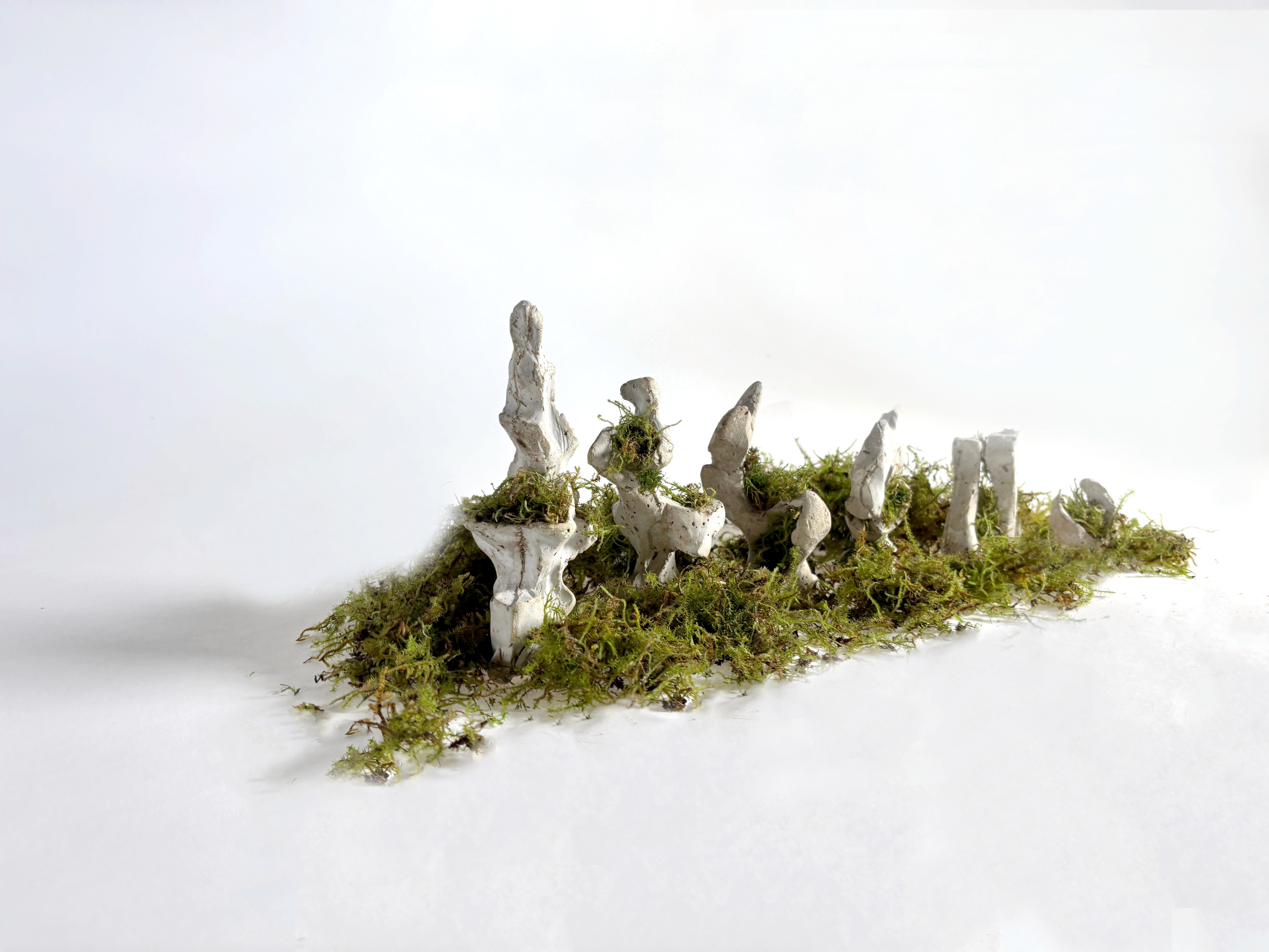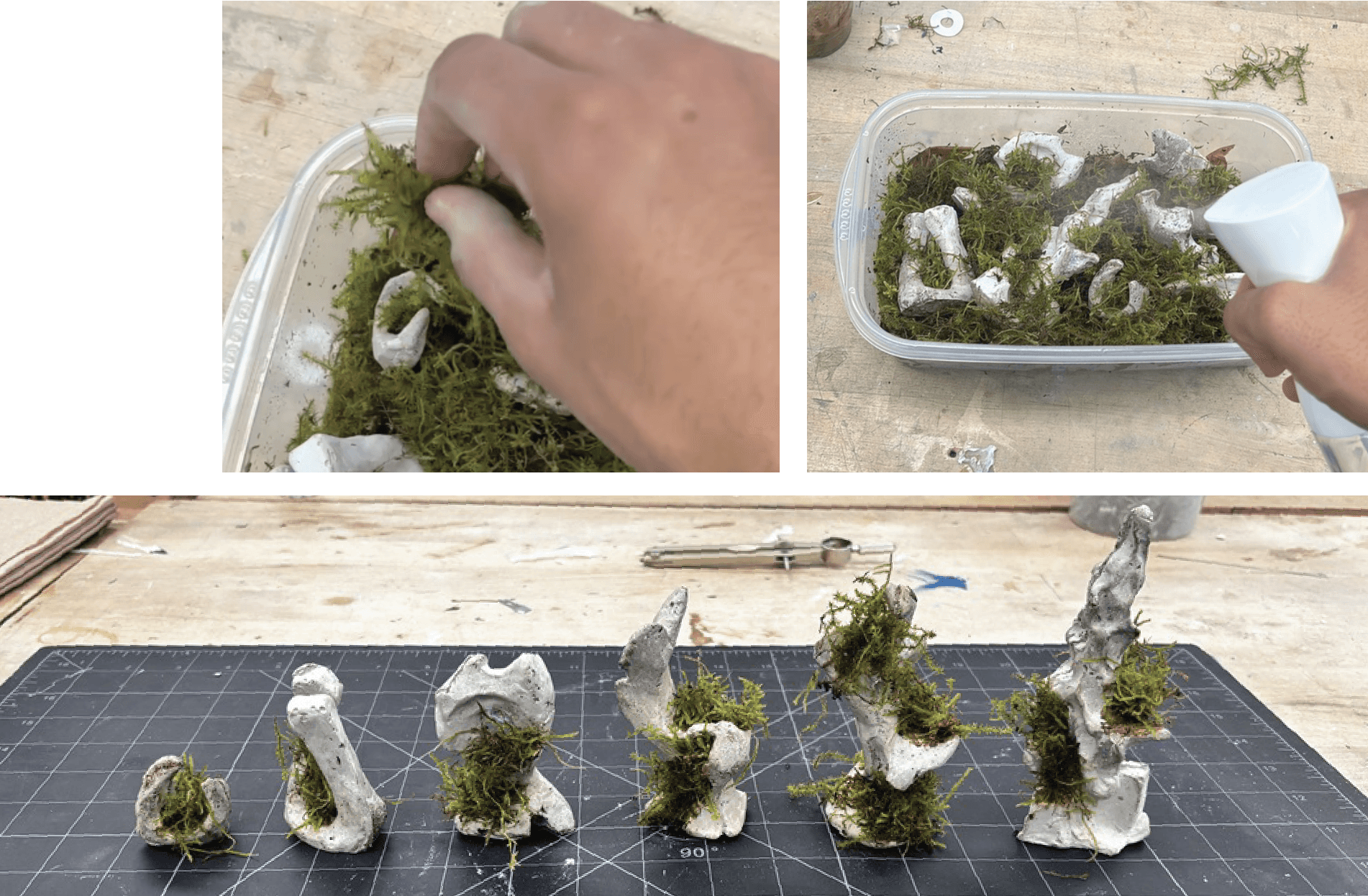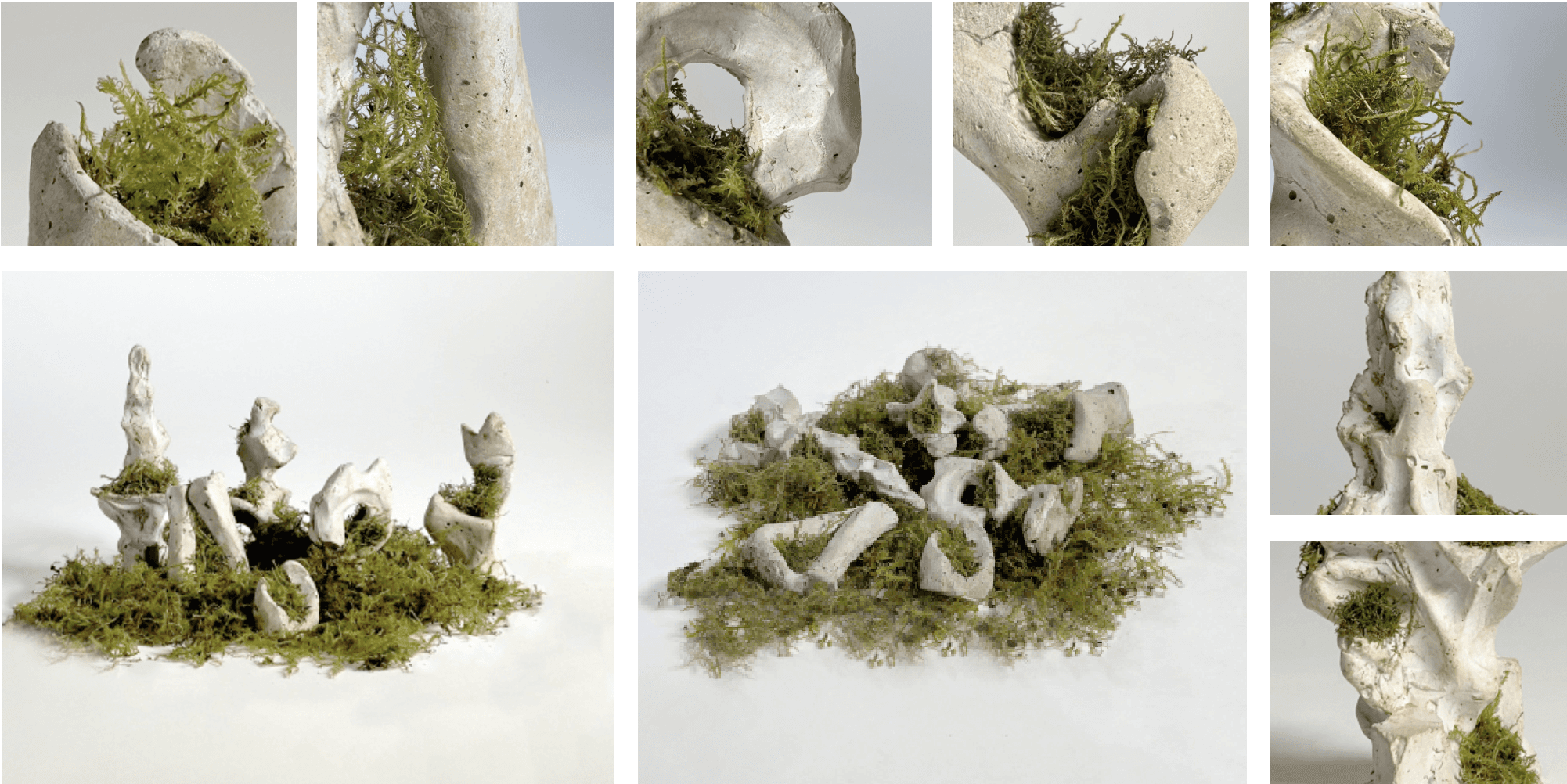 The moss was planted into the crevices of each piece, using a soil and sugar-water mixture as a natural glue to adhere the plant life