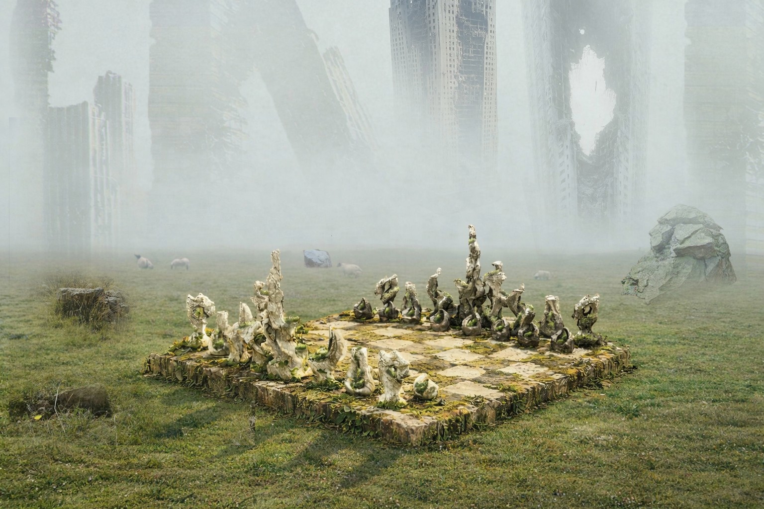 Design a chess set that explores the intersection of man-made infrastructure and nature’s persistence.