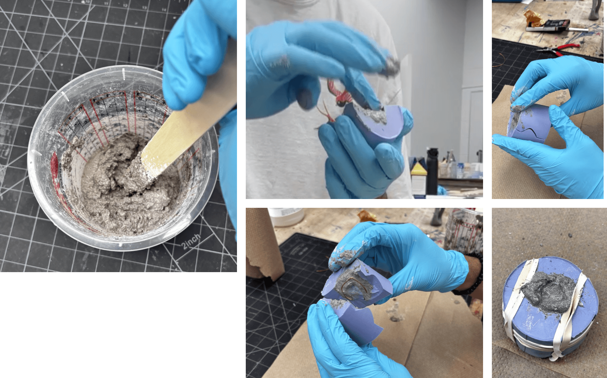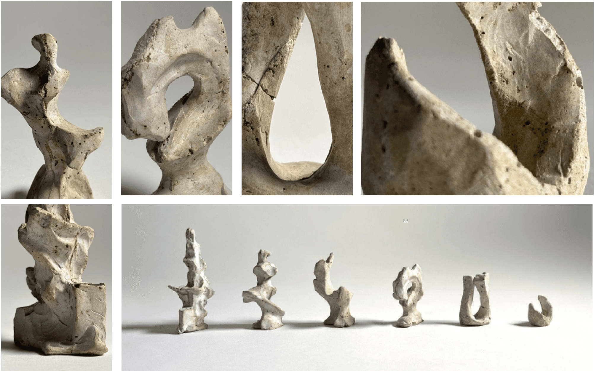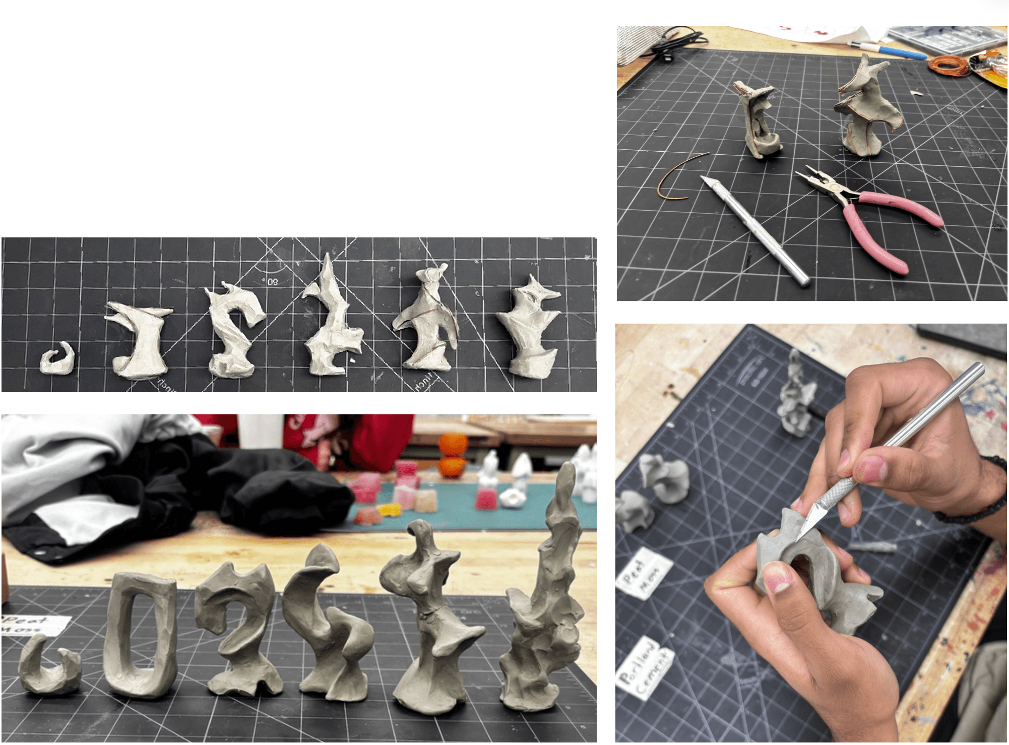 Using sulfur-based plastolina to sculpt each form by hand and by using sculpting tools. Experimented with copper wire as rebar to support the concrete as it sets.